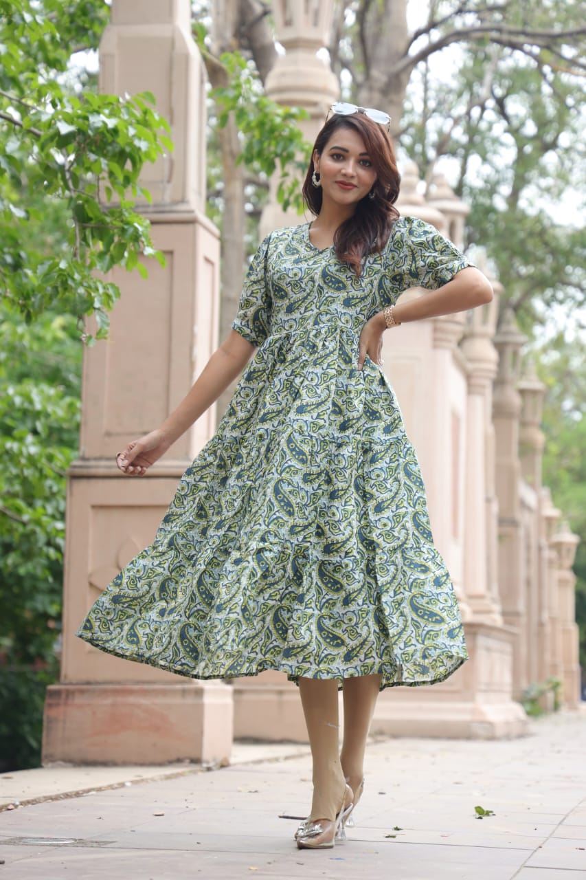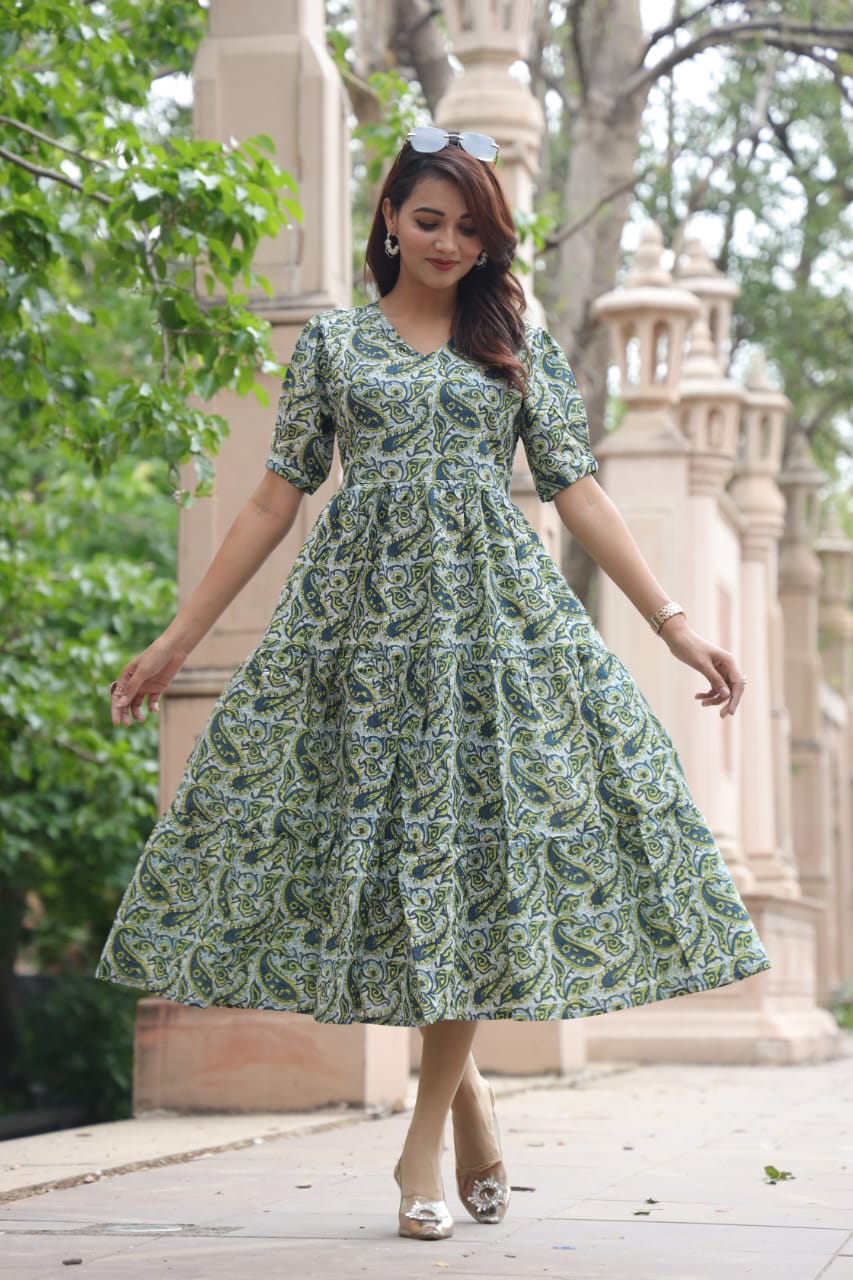 + Free ShippingBagru Hand Block Printed Cotton Frill One Piece Dress in multiple Beutiful Colour